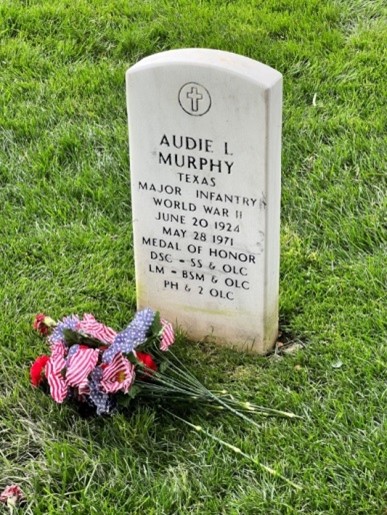 After the moving display of the changing of the guard, we got back on the buses and were taken to another location in the cemetery where our guide pointed out the graves of several famous people buried there. We got out and had some time to look around and the one grave I remember most was that of Audie Murphy, the most decorated soldier in World War II. I wonder how many of our classmates remember going to the movie theaters on Saturday afternoons and watching Audie Murphy in the cowboy and combat films. That’s how I remembered him, not realizing at the time that he wasn’t just a hot shot movie hero, he was a REAL hero.